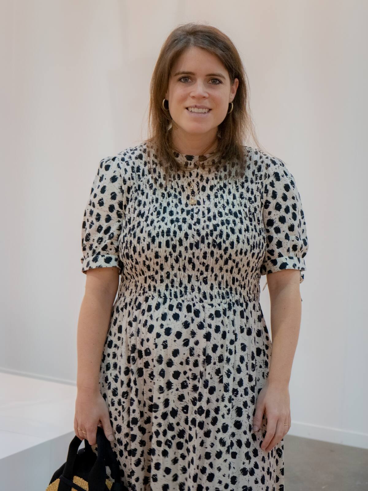 Con un look casual compuesto por un vestido blanco con lunares negros, tenis, una bolsa de mano tipo tejida de color negro con amarilla, la princesa Eugenia se paseó por la galería como una persona normal, el equipo que la acompañaba evitó que llamará la atención de los asistentes.