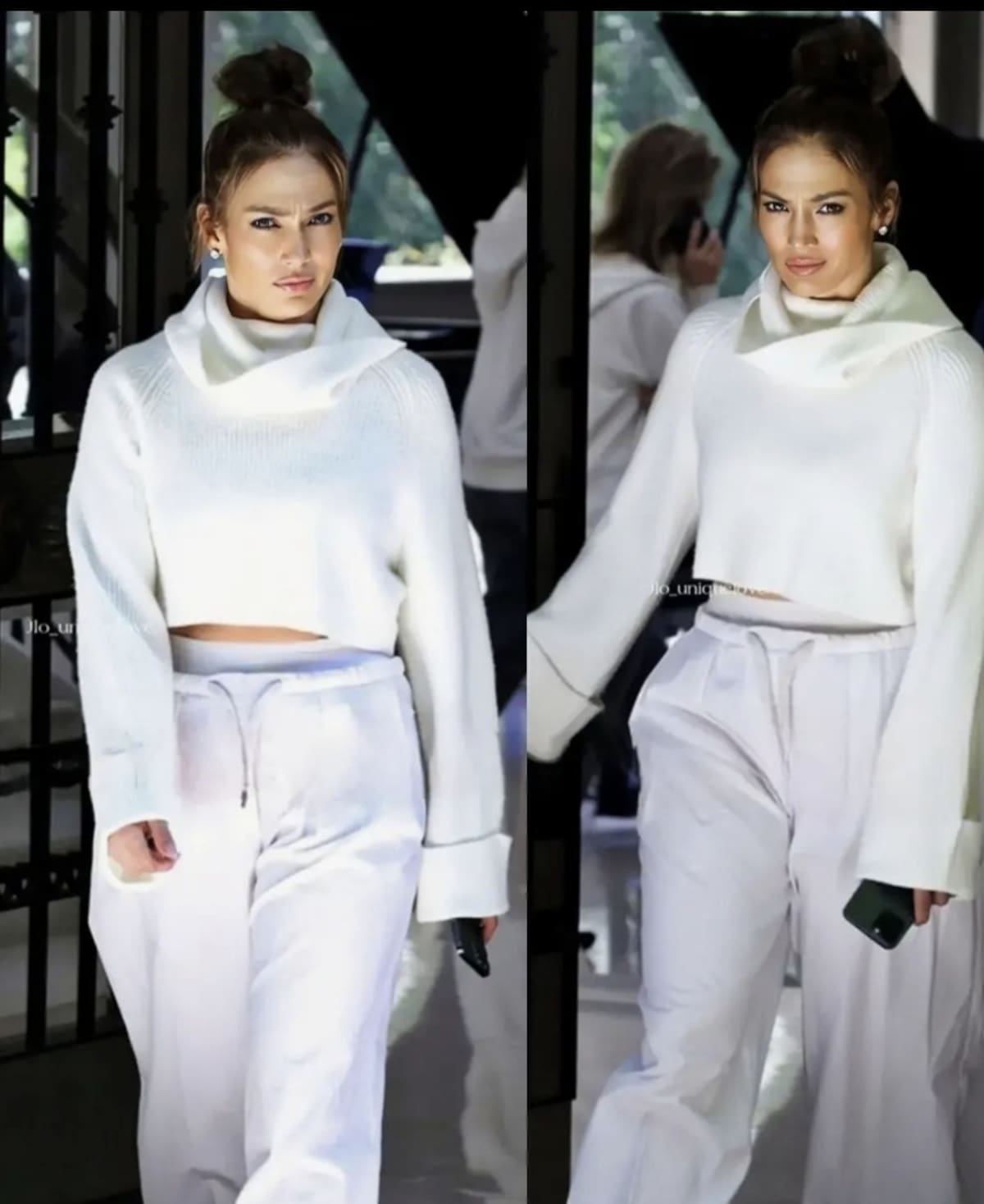 La “Diva del Bronx” usó un atuendo cómodo completamente blanco, con un suéter y un pants holgado. La cantante de "Let's Get Loud" lució botas blancas y aretes plateados, su cabello estaba amarrado.