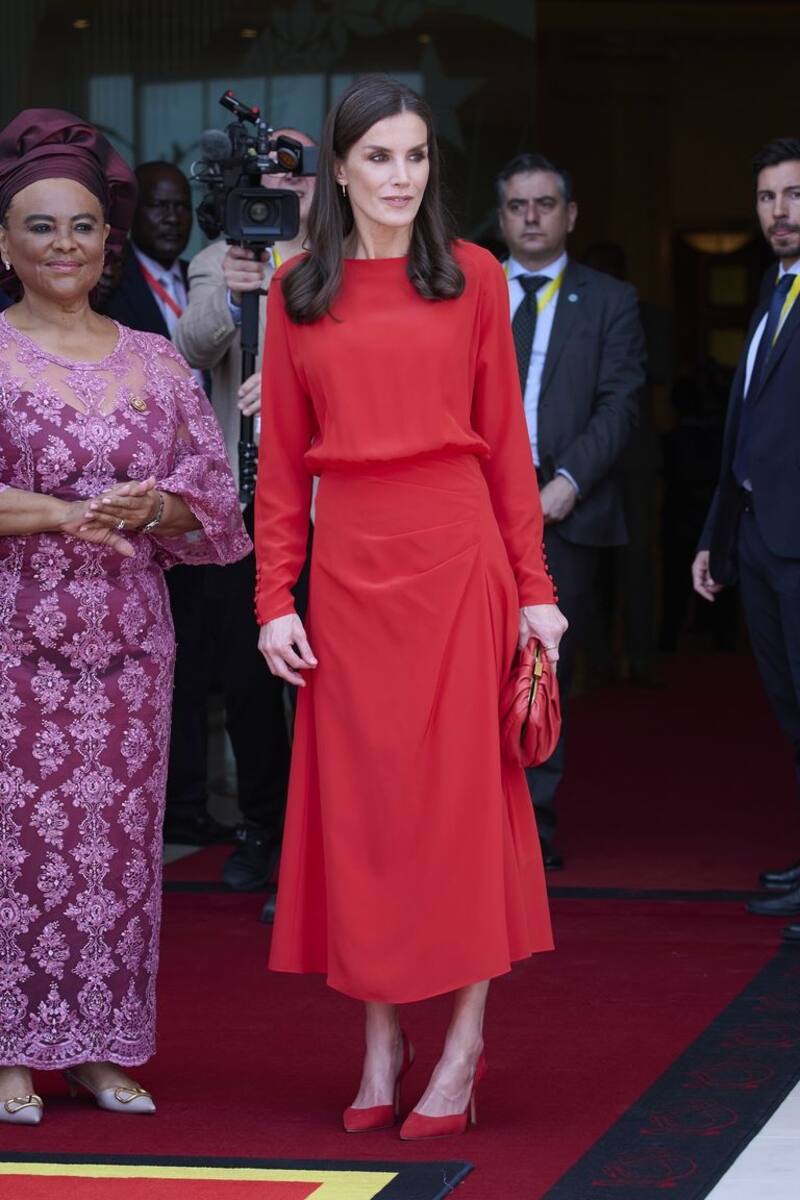 Para el acto de despedida de los reyes en Angola, Letizia recuperó uno de sus vestidos rojos más icónicos. Se trata de un modelo de Massimo Dutti, que es la tercera vez que se le ve. La prenda la estrenó en el 2020 en una de sus visitas al Museo del Prado, y optó por combinarla de la misma manera.