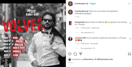 Ricardo Arjona está por ofrecer conciertos en México. Están programados para el mes de marzo de 2023: el 11 en Mérida, 14 y 15 en Monterrey, 18 y 19 en Guadalajara, 25 en CDMX, 29 en Hermosillo y 31 en Tijuana.