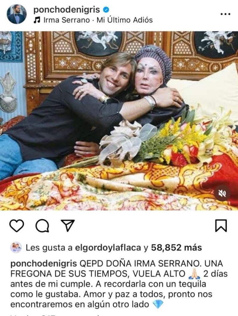 “QEPD DOÑA IRMA SERRANO. UNA FREGONA DE SUS TIEMPOS, VUELA ALTO. 2 días antes de mi cumple. A recordarla con un tequila como le gustaba. Amor y paz a todos, pronto nos encontraremos en algún otro lado”, escribió en su cuenta de Instagram.