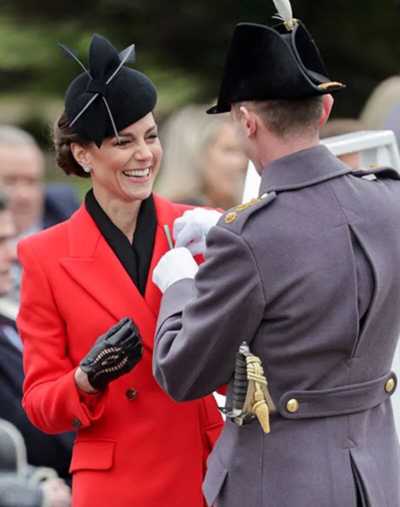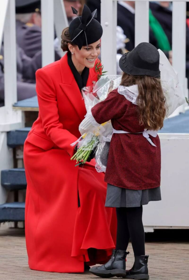 Por otro lado, Kate Middleton, quien vistió un llamativo abrigo rojo de Alexander McQueen rindiendo tributo a la bandera de Gales, se dejó ver muy sonriente en todo momento. Desde que aceptó el ramo de flores que le obsequió una niña hasta el pin de puerro que recibió entre risas durante el desfile.