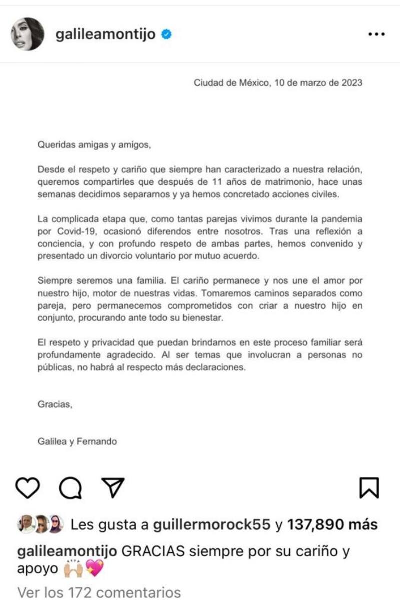 "Desde el respeto y cariño que siempre han caracterizado a nuestra relación, queremos compartirles que después de 11 años de matrimonio, hace unas semanas decidimos separarnos y ya hemos concretado acciones civiles", escribió Montijo en un comunicado que subió en sus redes sociales.