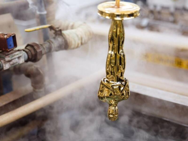 Enchapada en oro britanio sobre una base de metal negra, con 34 centímetros de altura, estos premios pesan 3,85 kilogramos.