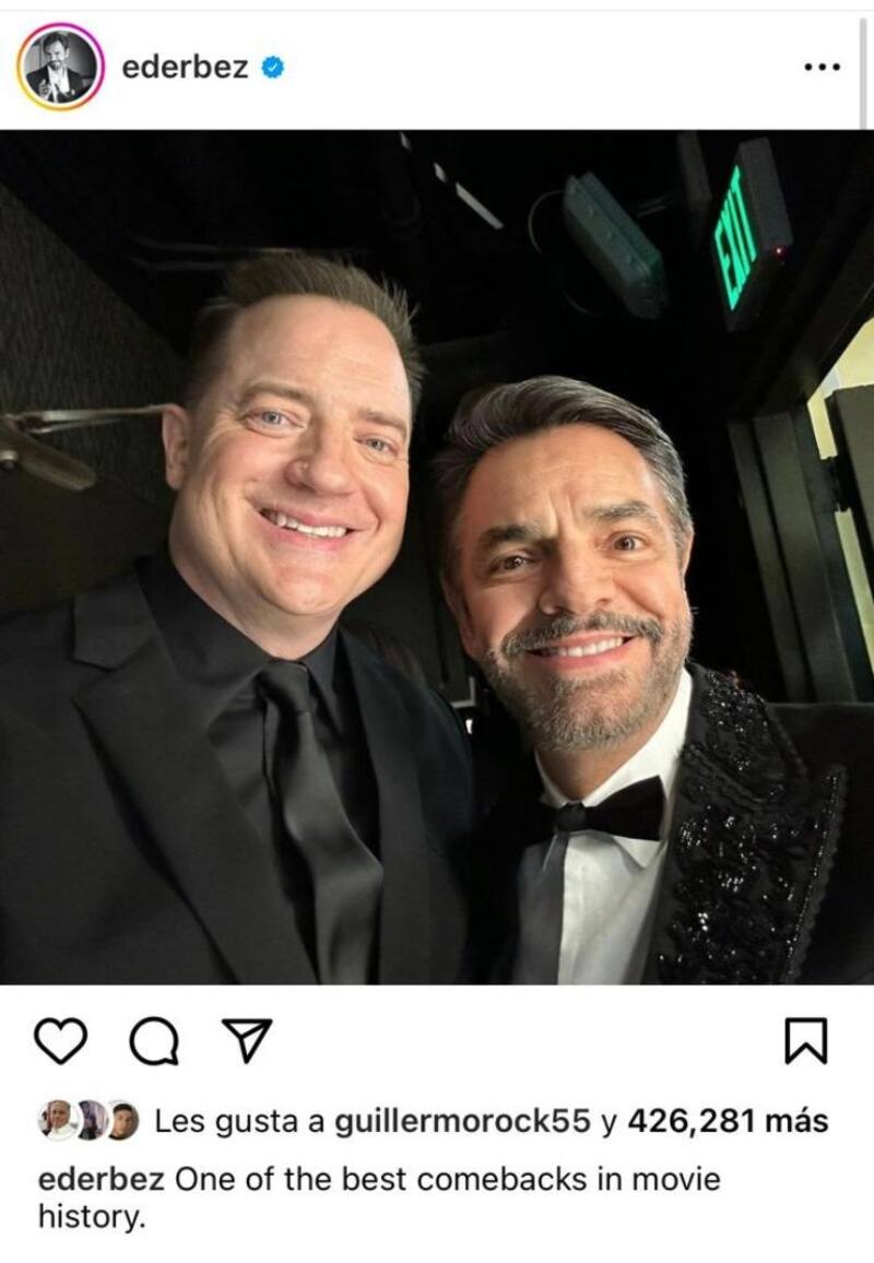 Tras lograr gran popularidad con su regresó a la pantalla grande, Eugenio Derbez no perdió la oportunidad de acercarse al ganador de una presea dorada, Brendan Fraser, y compartir una instantánea a su lado.