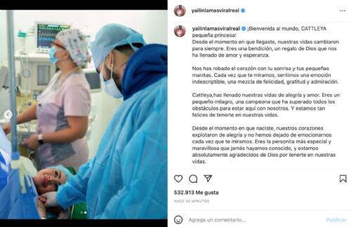 “¡Bienvenida al mundo, CATTLEYA pequeña princesa! Desde el momento en que llegaste, nuestras vidas cambiaron para siempre. Eres una bendición, un regalo de Dios que nos ha llenado de amor y esperanza”, inició Yailin La Más Viral en su extenso texto.