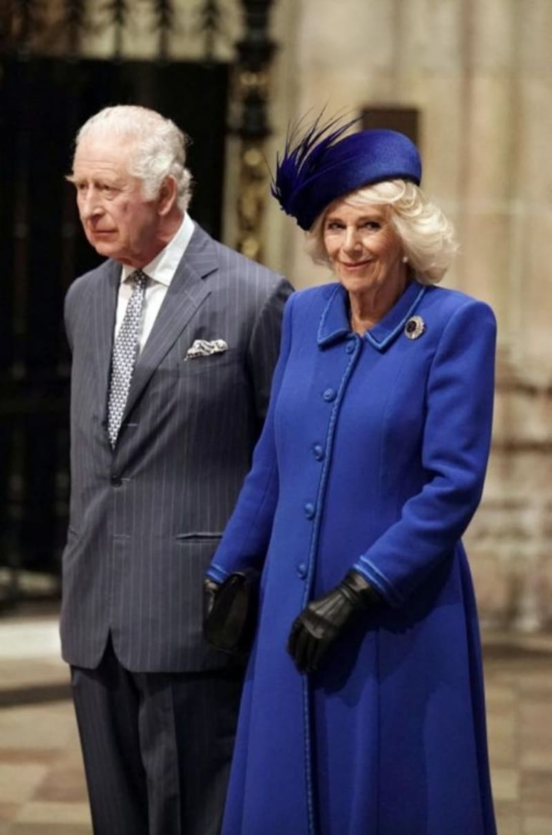 La reina Camila utilizó un vestido azul, color favorito del madre del rey Carlos III, con un abrigo largo abotonado, de la diseñadora Fiona Clare, y un tocado de plumas a juegos Philip Treacy, atuendo que hace un guiño a la reina Isabell II.