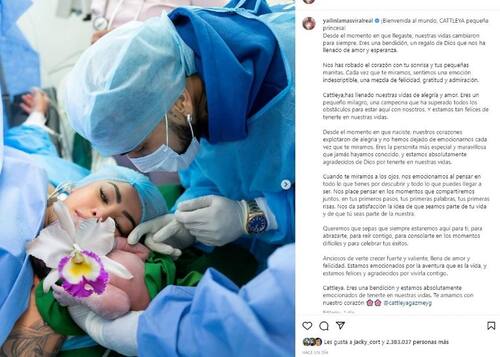 “¡Bienvenida al mundo, CATTLEYA pequeña princesa! Desde el momento en que llegaste, nuestras vidas cambiaron para siempre. Eres una bendición, un regalo de Dios que nos ha llenado de amor y esperanza…” escribió al inicio de la publicación en la que incluyó dos fotos que ilustran el momento del parto.