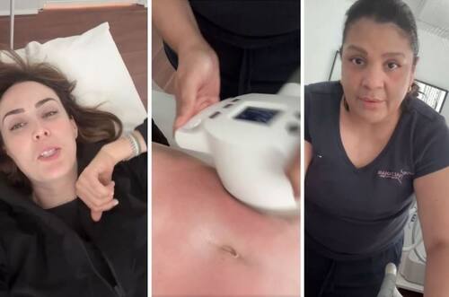 En las imágenes se ve a Jacky Bracamontes recostada sobre una camilla sin una gota de maquillaje, mientras la especialista Danis Altamar explica paso a paso cómo funciona uno de los aparatos que le colocan sobre el abdomen que se muestra ligeramente enrojecido.