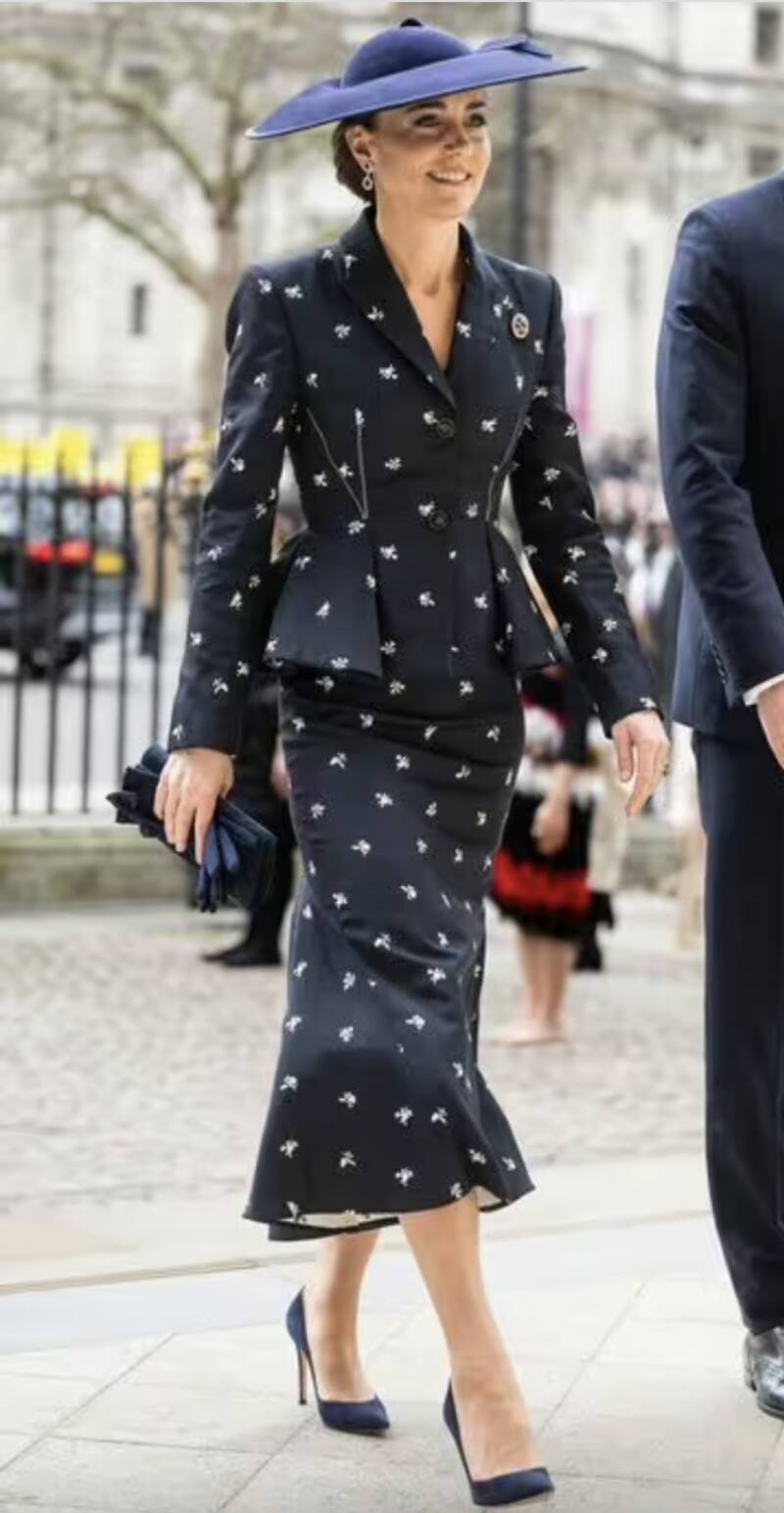 Para la ocasión, la princesa de Gales optó por una moderna chaqueta floral y una falda a juego de uno de sus diseñadores favoritos, Erdem Moralioglu. Para acompañar su elegante atuendo azul marino, Kate Middleton se puso un par de aretes de zafiros y diamantes que anteriormente pertenecieron a la difunta madre de William, la princesa Diana.