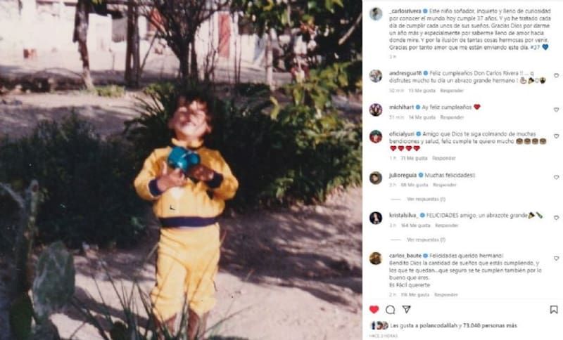 “Este niño soñador, inquieto y lleno de curiosidad por conocer el mundo hoy cumple 37 años. Y yo he tratado cada día de cumplir cada uno de sus sueños. Gracias Dios por darme un año más y especialmente por saberme lleno de amor hacia donde mire. Y por la ilusión de tantas cosas hermosas por venir. Gracias por tanto amor que me están enviando este día.”, escribió al pie de una tierna foto de él siendo un niño.