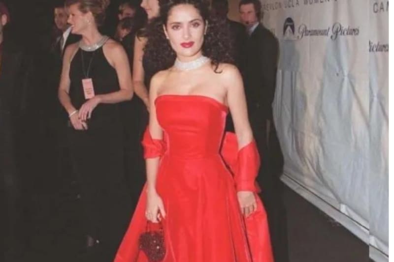Hace 26 años, Hayek lució el vestido con una gargantilla de diamantes, un chal, un sobre de lentejuelas y el cabello rizado.