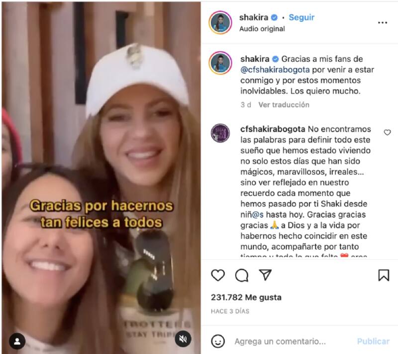 “Gracias a mis fans de @cfshakirabogota por venir a estar conmigo y por estos momentos inolvidables. Los quiero mucho”, escribió la artista en su publicación.