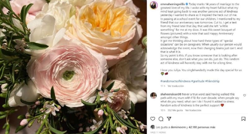 "Hoy se cumplen 14 años de matrimonio con el amor más grande de mi vida. Me desperté con el corazón lleno, pero mi mente seguía recordando el acto de bondad de otra persona ayer que quería compartir, ya que me inspiró muchísimo”, escribió.