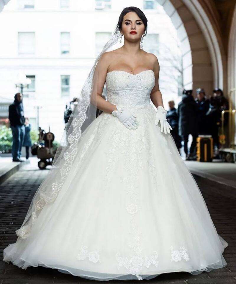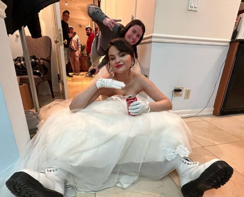 Tal como hizo la tarde de este martes mostrando un adelanto de lo que se podrá ver en uno de los episodios: Selena Gomez con un enorme vestido de novia. La actriz se dejó ver posando desde el piso muy sonriente, con un elegante vestido blanco, guantes y botas del mismo color.