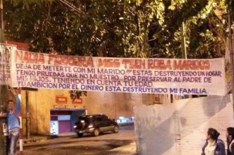 En ese acto, se vio a una manta que decía: "Nadia Ferreira, deja de meterte con mi marido. Estás destruyendo un hogar. Tengo pruebas que no muestro por preservar al padre de mis hijos. Teniendo en cuenta tu edad. Tu ambición por el dinero está destruyendo mi familia”.