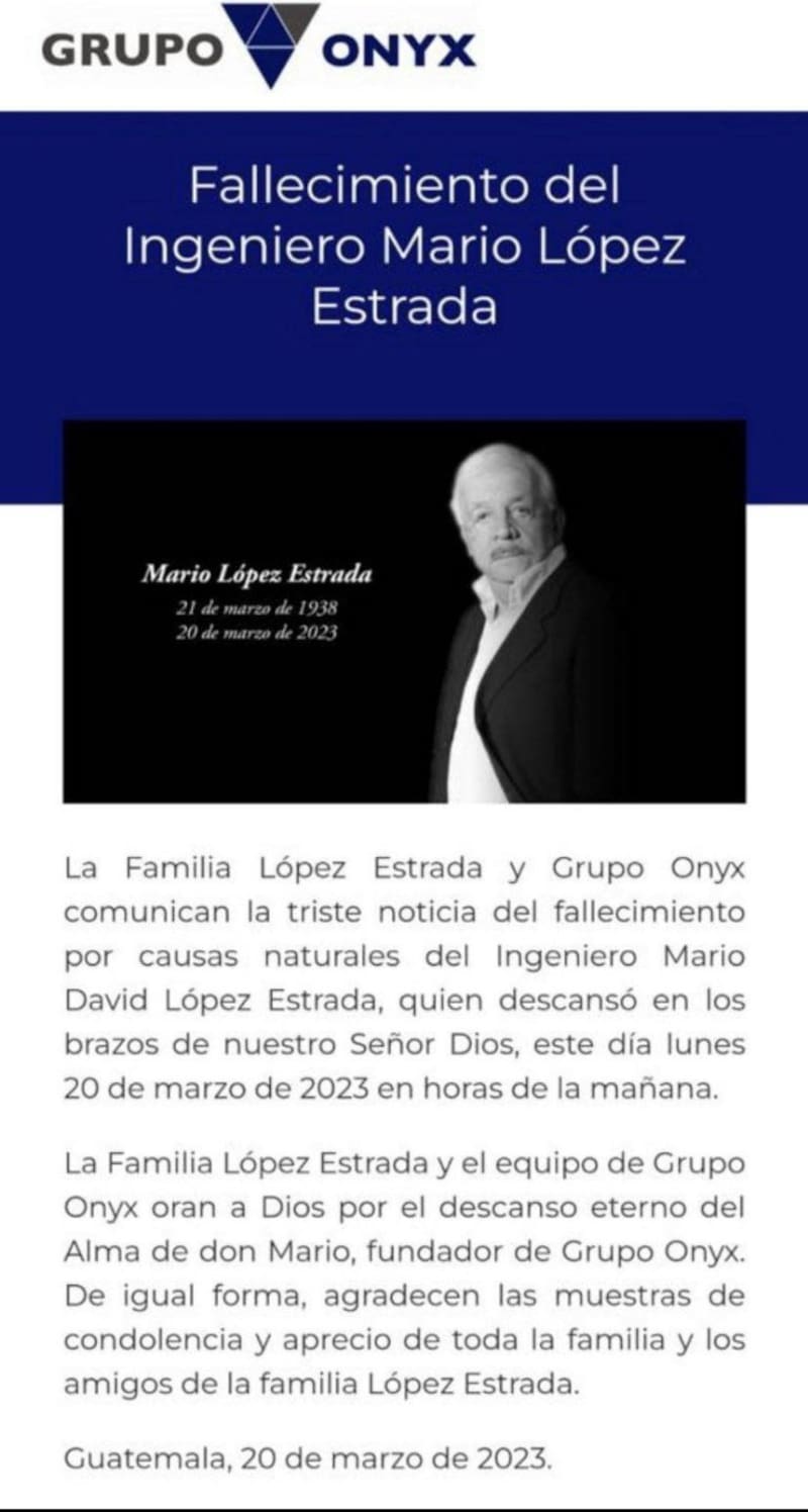 “La familia López Estrada y el equipo de Grupo Onyx oran a Dios por el descanso eterno del alma de don Mario, fundador de Grupo Onyx. De igual forma, agradecen las muestras de condolencia y aprecio de toda la familia y los amigos de la familia López Estrada”, informó la familia en un comunicado.