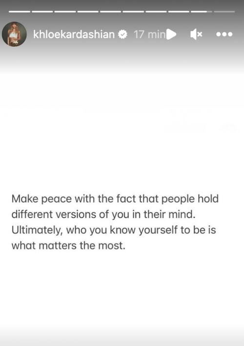 “Haz paz con el hecho de que las personas tienen diferentes versiones de ti en su mente. Ultimamente, que su pesas quien eres es lo que más importa”, se lee en la fotografía que compartió Khloé Kardashian a través de sus historias de Instagram.