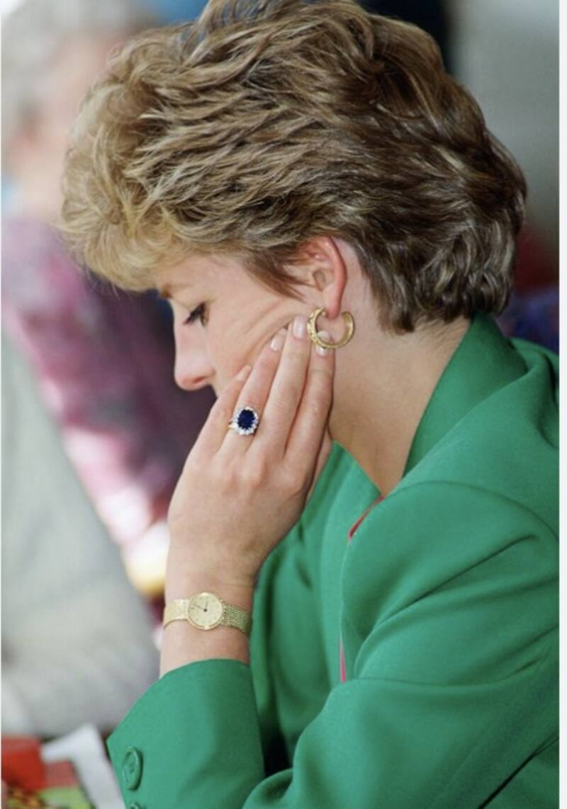 "Diana, siempre una fashionista con visión de futuro, mostró inteligentemente este anillo al mundo con una falda azul zafiro a juego.