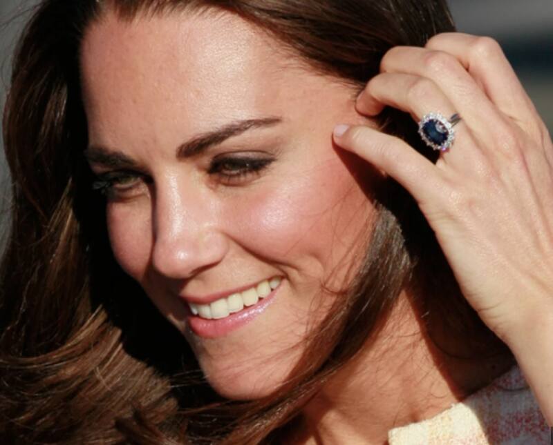 El anillo de compromiso de princesa Diana, que ahora pertenece a Kate Middleton, es un zafiro de Ceilán de 12 quilates montado en oro blanco de 18 quilates, flanqueado por 14 diamantes solitarios.