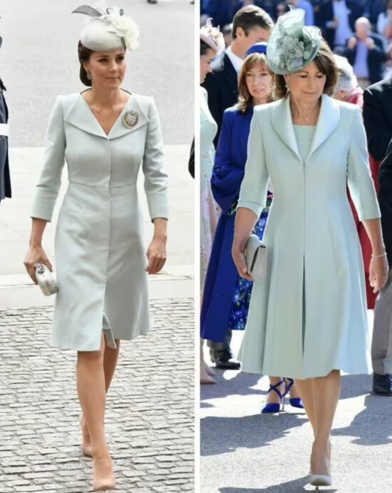 En 2018, Carole Middleton y Kate Middleton volvieron a ser gemelas de estilo. Carole asistió a la boda del príncipe Harry y Meghan Markle en Windsor con un abrigo azul pastel de Catherine Walker.