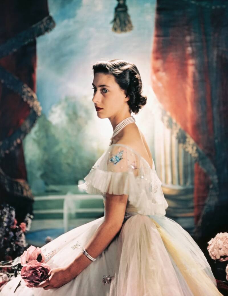Hace 72 años la princesa Margarita celebraba su vigésimo primer cumpleaños con la que ahora es considerada una icónica sesión de fotos. Para la ocasión la hermana de la reina Isabel II usó un impresionante vestido de Christian Dior blanco de tul concordados de mariposas de colores, un escote asimétrico dejando al descubierto uno de sus hombros y un cinturón blanco para marcar su figura.