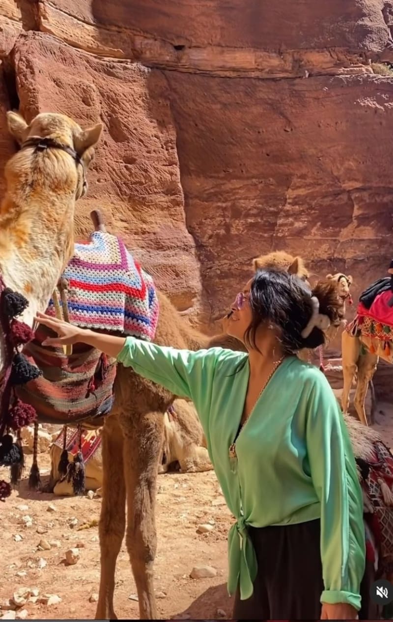 Asimismo compartió un breve video en el que muestra lo bien que se la está pasando, pues tuvo la oportunidad de estar muy cerca de un camello. “Paseando por las antiguas maravillas de Jordania, un paso a la vez”, escribió en su post.