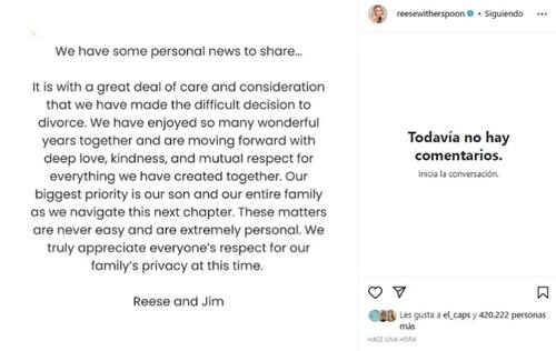 "Tenemos algunas noticias personales para compartir... Es con mucho cuidado y consideración que hemos tomado la difícil decisión de divorciarnos", dijeron en un comunicado conjunto. "Hemos disfrutado de tantos años maravillosos juntos y estamos avanzando con profundo amor, amabilidad y respeto mutuo por todo lo que hemos creado juntos".