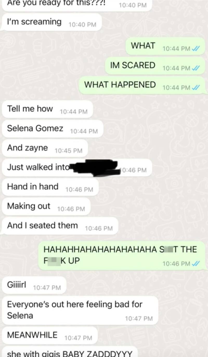 A través de TikTok la usuaria Klarissa Garcia aseguró que una de sus amigas que trabaja como hostess en un exclusivo restaurante en Manhattan captó a los cantantes muy románticos. “Dime cómo Selena Gomez y Zayn entraron al (nombre del lugar) tomados de la mano y besándose y yo los senté”, se lee en la captura de mensaje que compartió la internauta como prueba.