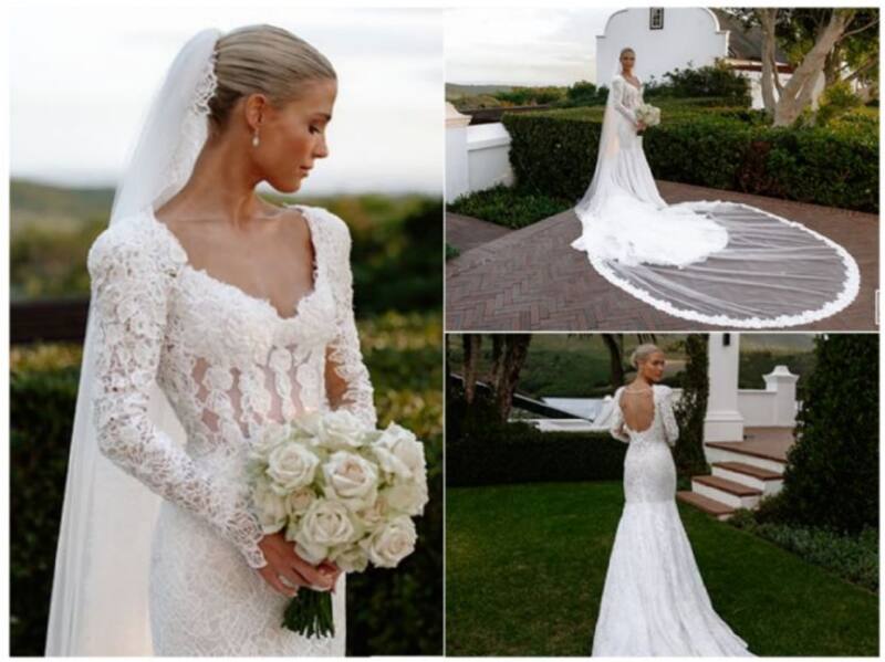 Su outfit nupcial, lo combinó con un elegante velo de cinco metros de largo en fino tul de seda y zapatos Jimmy Choo. "Soy la chica más afortunada del mundo. Honestamente, es el vestido más hermoso que he visto en mi vida. Ha sido la experiencia más feliz de trabajar con Versace. Cada miembro de su equipo fue como un ángel", declaró.