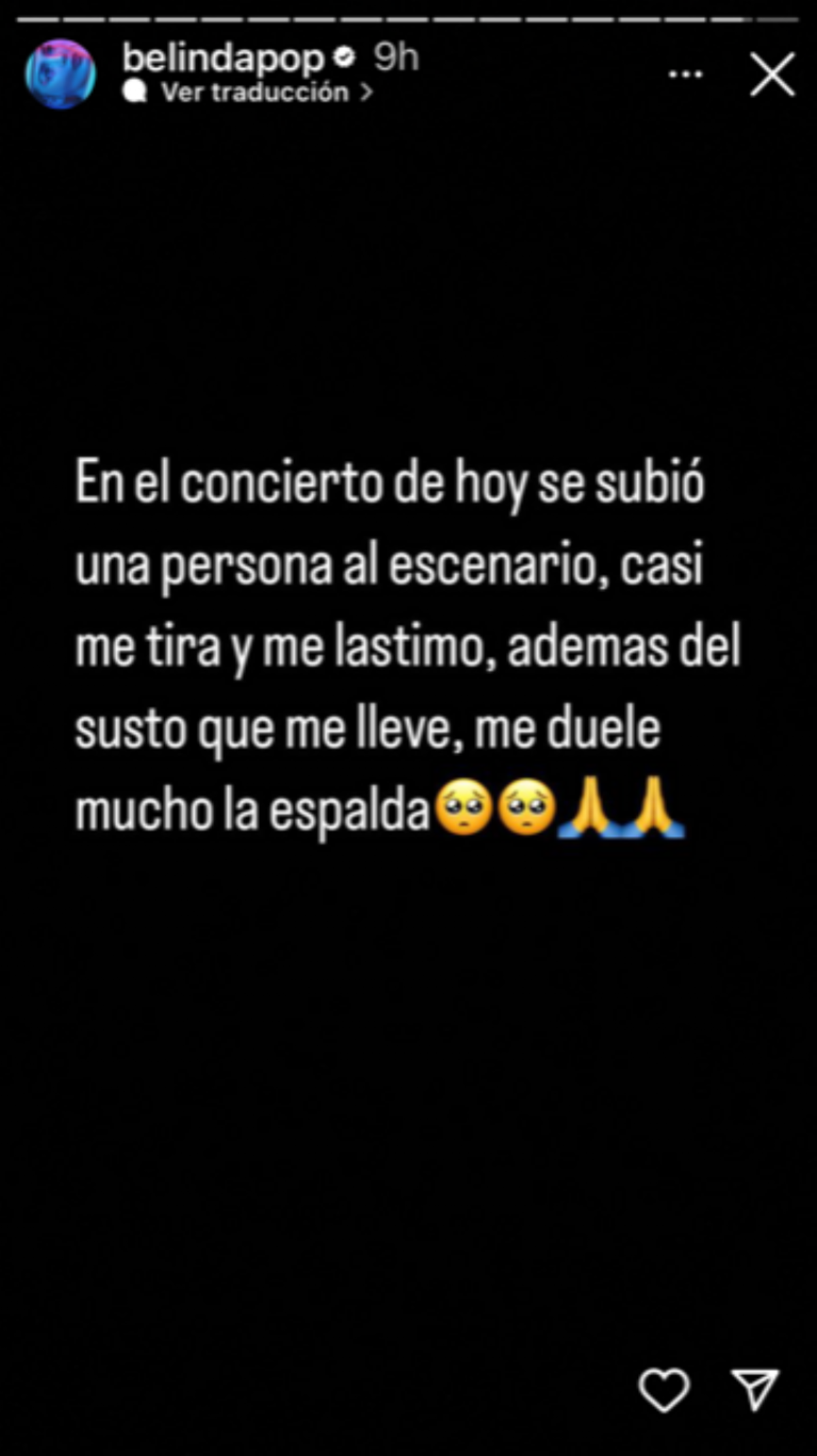 A través de sus historias de Instagram, la cantante habló de la situación y dijo que le dolía la espalda por la manera en que la persona la jaló y por poco la tira, sin embargo, no dio más detalles al respecto.