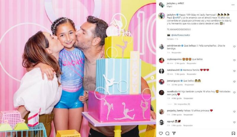 “Happy 10th Bday mi Jacky hermosa!! Papá @mft07 y yo te amamos con el alma!!! Hace 10 años nos convertiste en papás por primera vez y nos cambiaron la vida tú y tu hermanito que nos cuida a diario desde el cielo!!! TE AMAMOOOOOOS!!!”, escribió la ex reina de belleza al pie de una publicación con una serie de fotos que muestran detalles de la fiesta de cumpleaños que le organizaron a la pequeña, que en esta ocasión eligió como temática cosas referentes a la gimnasia rítmica, un deporte en el que destaca.