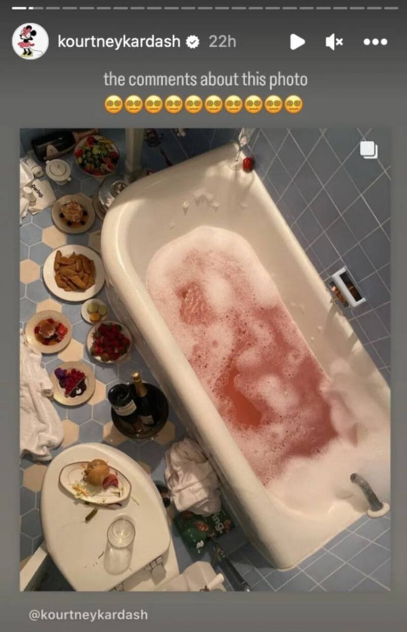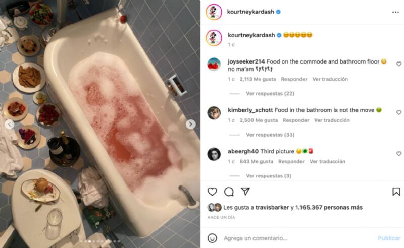 Sin embargo, lo que más llamó la atención de sus seguidores fue la imagen de su baño en la que se aprecia una tina con agua rosa espumosa y varios platos de comida esparcidos por el piso e incluso en la tapa del inodoro. La publicación se llenó con comentarios negativos expresando su asco junto a emoticones de caras vomitando.