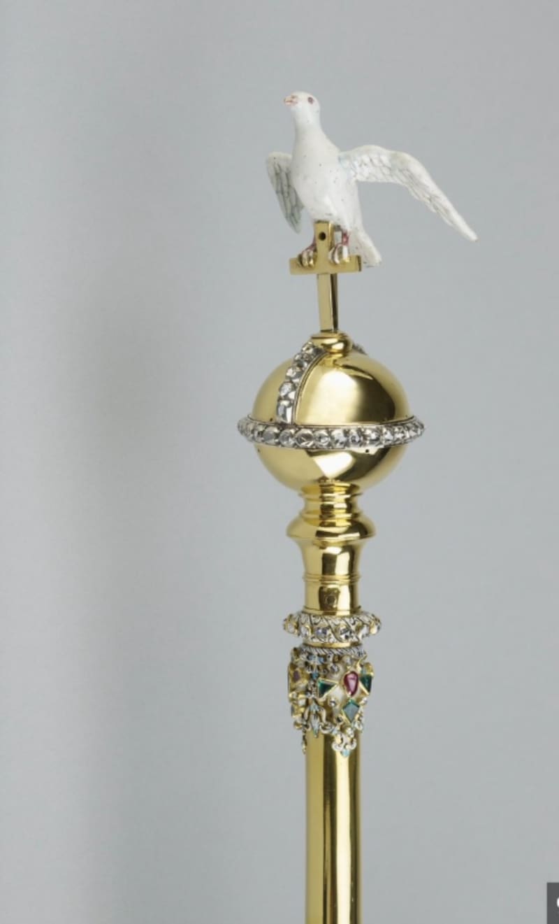 Formado por tres secciones de marfil, el cetro fue diseñado por el orfebre Sir Robert Vyner para María de Módena, la reina consorte del rey Jaime II.