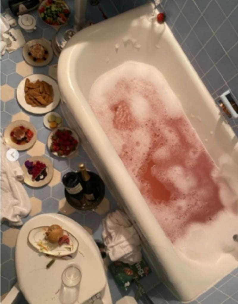 La socialité compartió una serie de fotografías del resumen de su semana, donde se ve algo “realmente asqueroso”, de acuerdo con algunos internautas. La que más llamó la atención fue la de su baño en la que se aprecia una tina con agua rosa espumosa y varios platos de comida esparcidos por el piso e incluso en la tapa del inodoro. La publicación se llenó con comentarios negativos expresando su asco junto a emoticones de caras vomitando.
