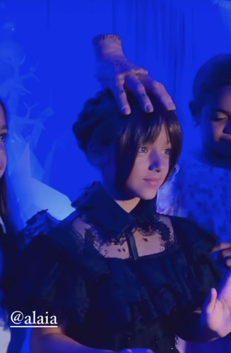 Alaïa Costa tuvo dos cambios de vestuario caracterizada como Merlina Addams, uno blanco con transparencias y medias de rombos, el otro fue el característico vestido negro con el que se vitalizó en redes sociales. Además, la pequeña de ahora ocho años lució su cabello recogido estrenando un fleco como el de Jenna Ortega en la serie