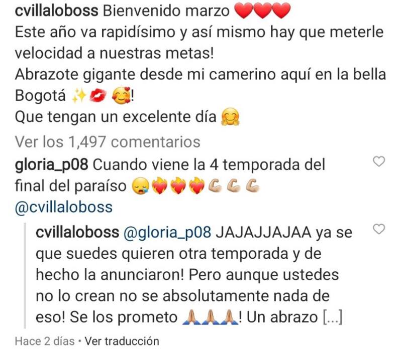 En medio de las especulaciones, Carmen Villalobos ha decidido salir a aclarar si será parte o no de la ficción. La colombiana respondió un comentario que un fanático le dejó en sus redes sociales, diciendo: "Ya sé que ustedes quieren otra temporada y de hecho la anunciaron. Pero aunque ustedes no lo crean no sé absolutamente nada de eso. Se los prometo”.