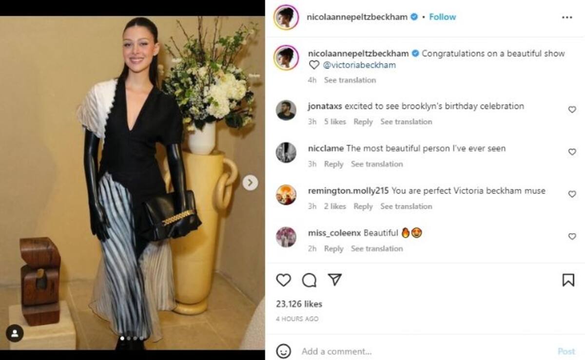 “No podría hacerlo sin ustedes, los quiero mucho a todos x”, escribió la ex Posh Spice, en sus redes sociales, tras la presentación de su línea de ropa, celebrando que toda la familia estuviera reunida. Pero también dedicó un historia a Nicola Peltz, quien parece haber firmado la paz con la familia de su esposo al usar un especial vestido.