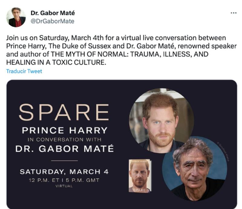 Luego del éxito que ha tenido “Spare” desde su lanzamiento el pasado 10 de enero, este sábado el duque de Sussex tuvo una reunión virtual con el dr. Gabor Maté. Durante su íntima conversación tocaron temas como la pérdida, estrés, desálalo infantil y cómo las experiencias del pasado del príncipe Harry han influido en su identidad al día de hoy.