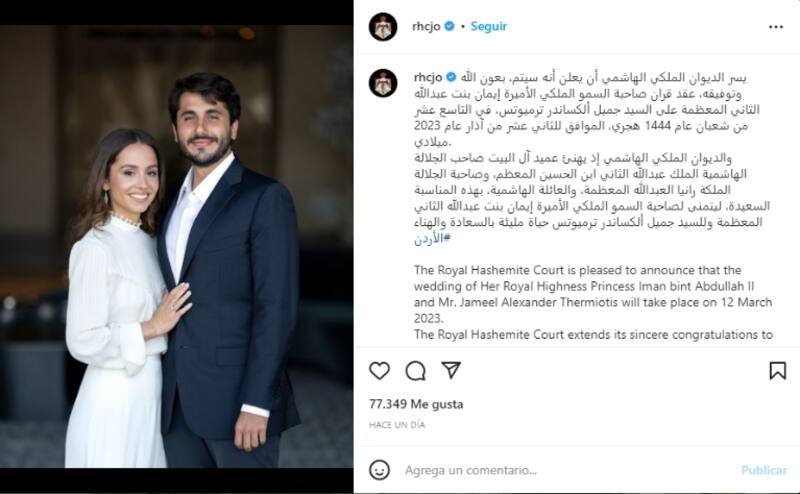 "La primera vez que sostuve a mi niña supe que mi vida no volvería a ser la misma. En una semana, será una novia. Mi preciosa Iman, estoy tan feliz por ti y tan orgullosa de todo lo que eres", se lee en la publicación de la orgullosa mamá, complementando el anuncio oficial de la Casa Real con un mensaje mucho más serio e institucional. "La Corte Real Hachemita se complace en anunciar que la boda de Su Alteza Real la Princesa Iman bint Abdullah II y el Sr. Jameel Alexander Thermiotis se llevará a cabo el día 12 de marzo del 2023", mencionan, dando a conocer la fecha de la gran celebración.