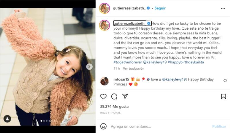Elizabeth Gutiérrez aprovechó su cuenta oficial de Instagram para mandarle una tierna felicitación. "¿Cómo pude tener tanta suerte de ser elegida para ser tu mamá? ¡Feliz cumpleaños mi amor! Que este año te traiga todo lo que tú corazón desee. Que siempre seas la niña buena, dulce, divertida, ocurrente, tonta, amorosa, juguetona. ¡¡El mejor abrazador!! y la lista puede seguir y seguir... Te mereces el mundo mi Kailita.. Mamá te ama tanto... No hay nada en el mundo que quiera más que verte feliz. ¡¡Te amo por siempre mi K!!", fue el texto que le escribió a su pequeña hija.