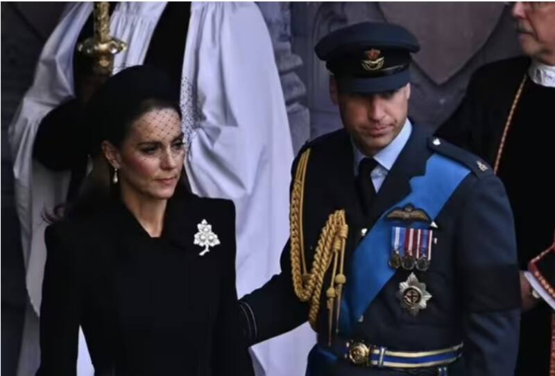 Más tarde ese año, después del triste fallecimiento de la Reina Isabel II, la Princesa de Gales se dirigió desde el Palacio de Buckingham a Westminster Hall para un servicio durante el período de duelo oficial. Con un atuendo completamente negro, se complementó con el broche Diamond and Pearl Leaf de la difunta monarca.