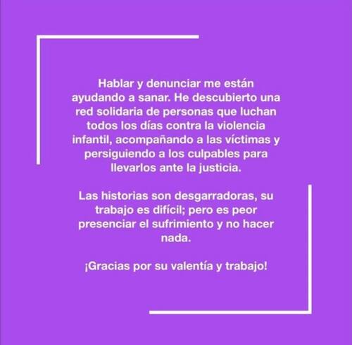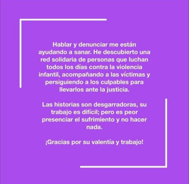 “Hoy se cumple un año de haber aceptado públicamente la relación asimétrica y abusiva que viví cuando era niña. El daño que me causó, me acompaña ahora como mujer. En ese tiempo he descubierto mucho. Por ejemplo, que no estoy sola y que quienes me creen me fortalecen; pero también que falta mucho por hacer para que la sociedad respalde a las víctimas”.