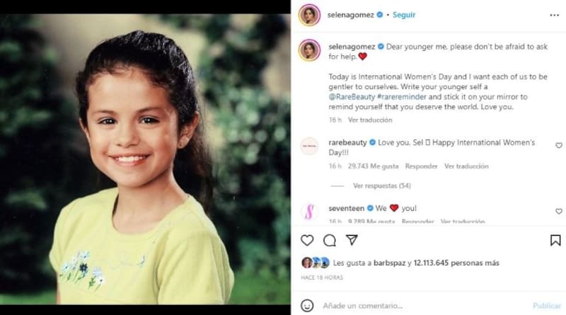 "Querida yo más joven, por favor no tengas miedo de pedir ayuda", escribió la cantante, para luego agregar: "Hoy es el Día Internacional de la Mujer y quiero que cada una de nosotras seamos más amables con nosotras mismas. Escríbele a tu yo más joven un @RareBeauty #rarereminder y pégalo en tu espejo para recordar que te mereces el mundo. Te amo".