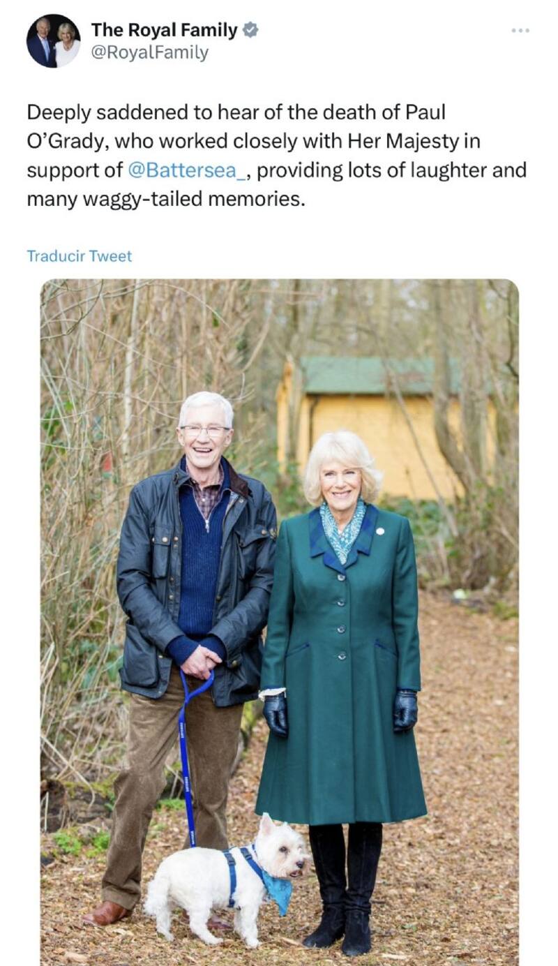 “Profundamente entristecidos al enterarnos de la muerte de Paul O'Grady, quien trabajó en estrecha colaboración con Su Majestad en apoyo de Battersea, proporcionando muchas risas y muchos conmovedores recuerdos", se lee en un comunicado de la cuenta oficial de Twitter de la familia real.