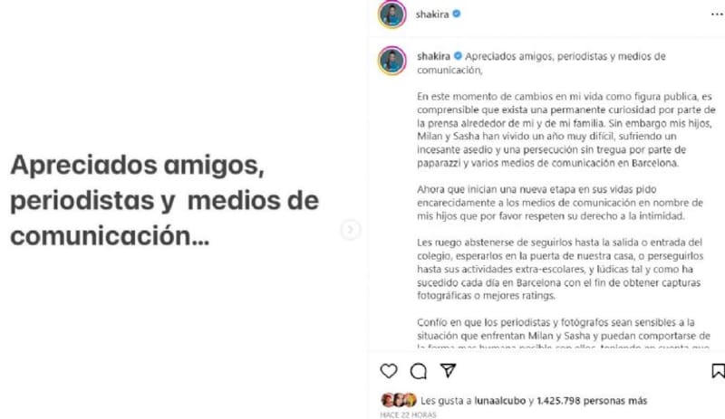 Es por ello que ayer y con motivo de su nueva residencia, Shakira a través de un extenso comunicado pidió a los medios parar el acoso a sus hijos, quienes se vieron muy afectados cuando radicaban en Barcelona teniendo las cámaras sobre ellos en cada lugar al que visitaban.