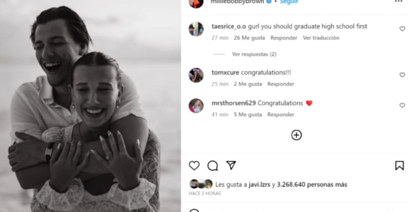Por medio de sus redes sociales, Millie Bobby Brown reveló el especial momento que vive actualmente, su pareja, Jake Bongiovi, le pidió matrimonio y ella aceptó sin dudarlo. La publicación se llenó de comentarios que le enviaron felicidades, pero también algunos que destacaron lo joven que es.