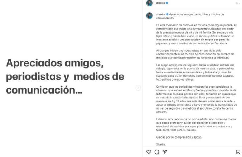 ''Mis hijos, Milan y Sasha han vivido un año muy difícil, sufriendo un incesante asedio y una persecución sin tregua por parte de paparazzis y varios medios de comunicación en Barcelona. Ahora que inician una nueva etapa en sus vidas pido encarecidamente a los medios de comunicación en nombre de mis hijos que por favor respeten su derecho a la intimidad'', publicó.