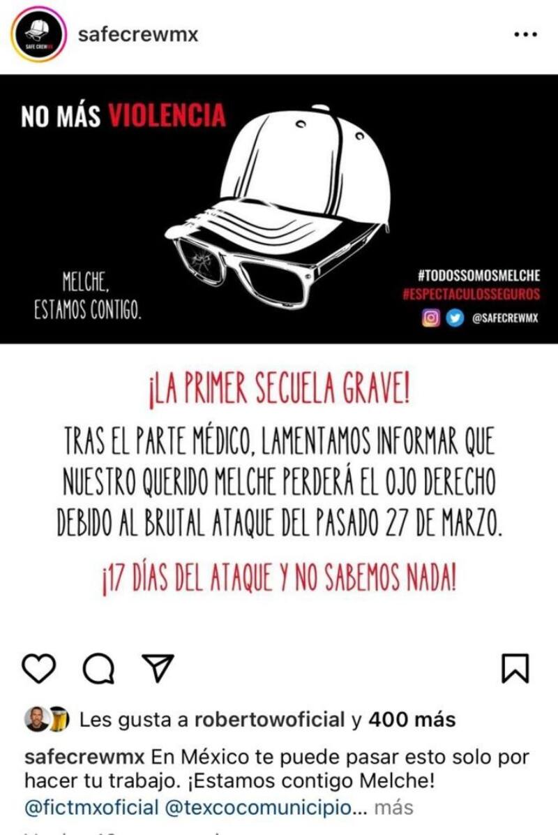 “La primera secuela grave. Tras el parte médico, lamentamos informar que nuestro querido Melche perderá el ojo derecho debido al brutal ataque del pasado 27 de marzo. 17 días del ataque y no sabemos nada”, informa a través de la cuenta de Instagram de ‘Safecrewmx’.