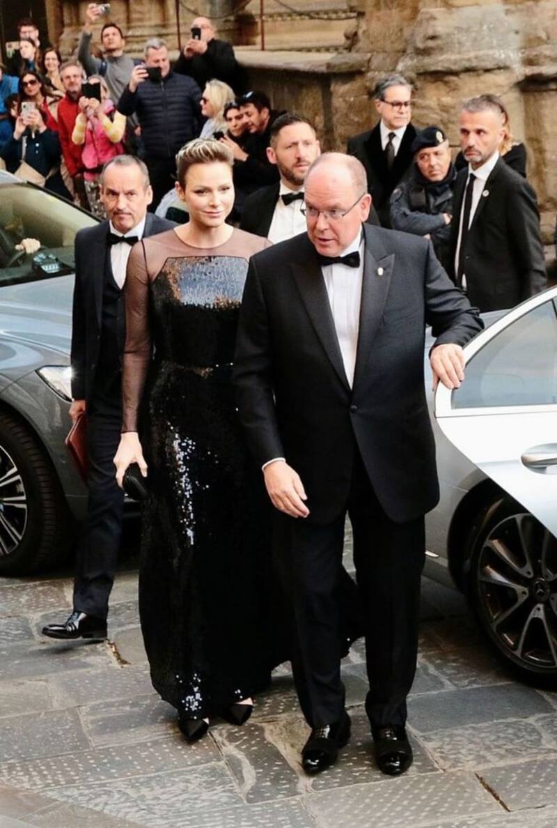 La princesa Charlene y el príncipe Alberto asistieron a una gala de recaudación de fondos en el Salone dei 500 del Palazzo Vecchio, donde la princesa deslumbró con un vestido Akris negro con lentejuelas y mangas semitransparentes.